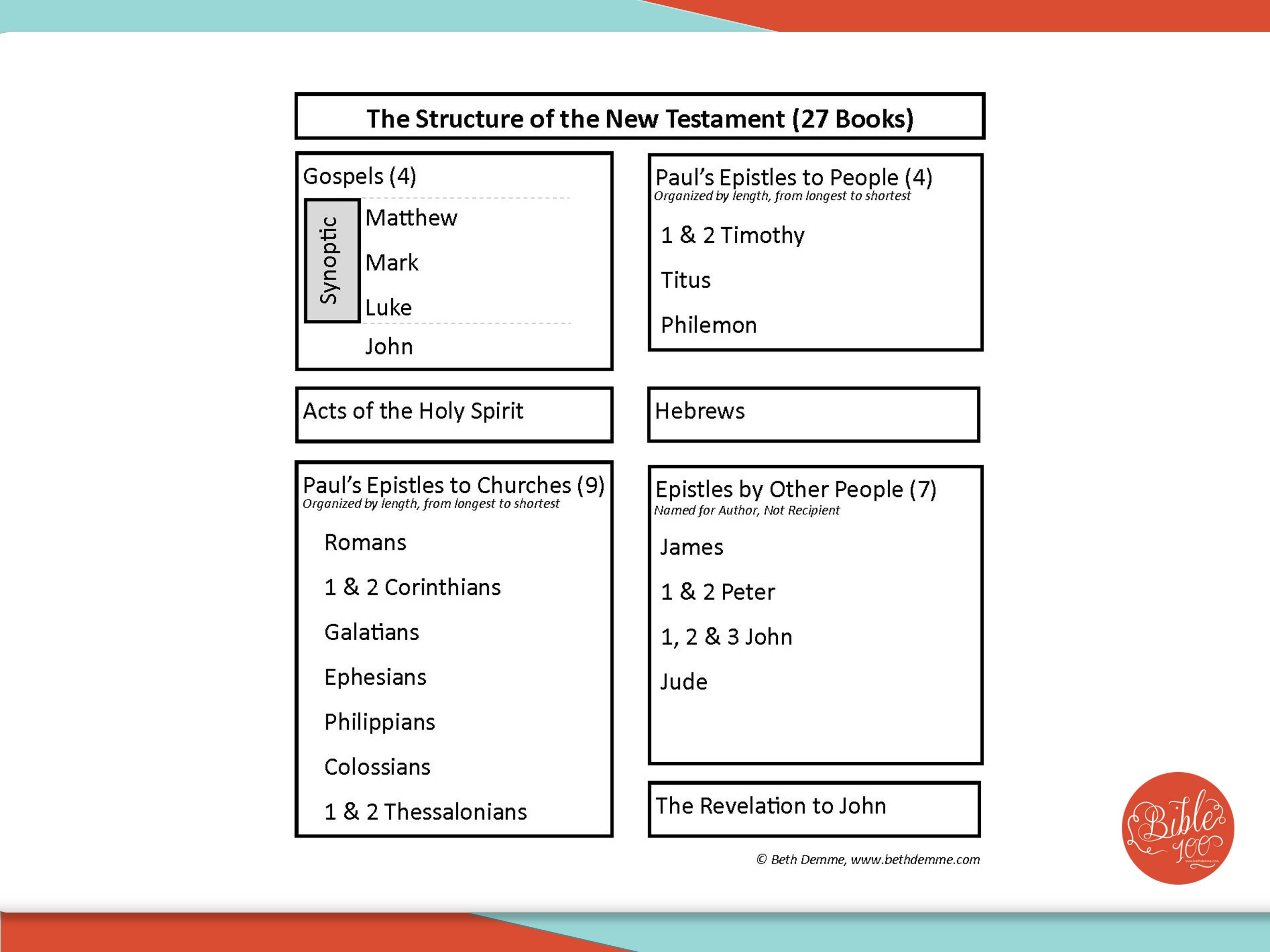 - Letters (4) from Paul to individuals, organized by length from longest to shortest and named for the recipient.